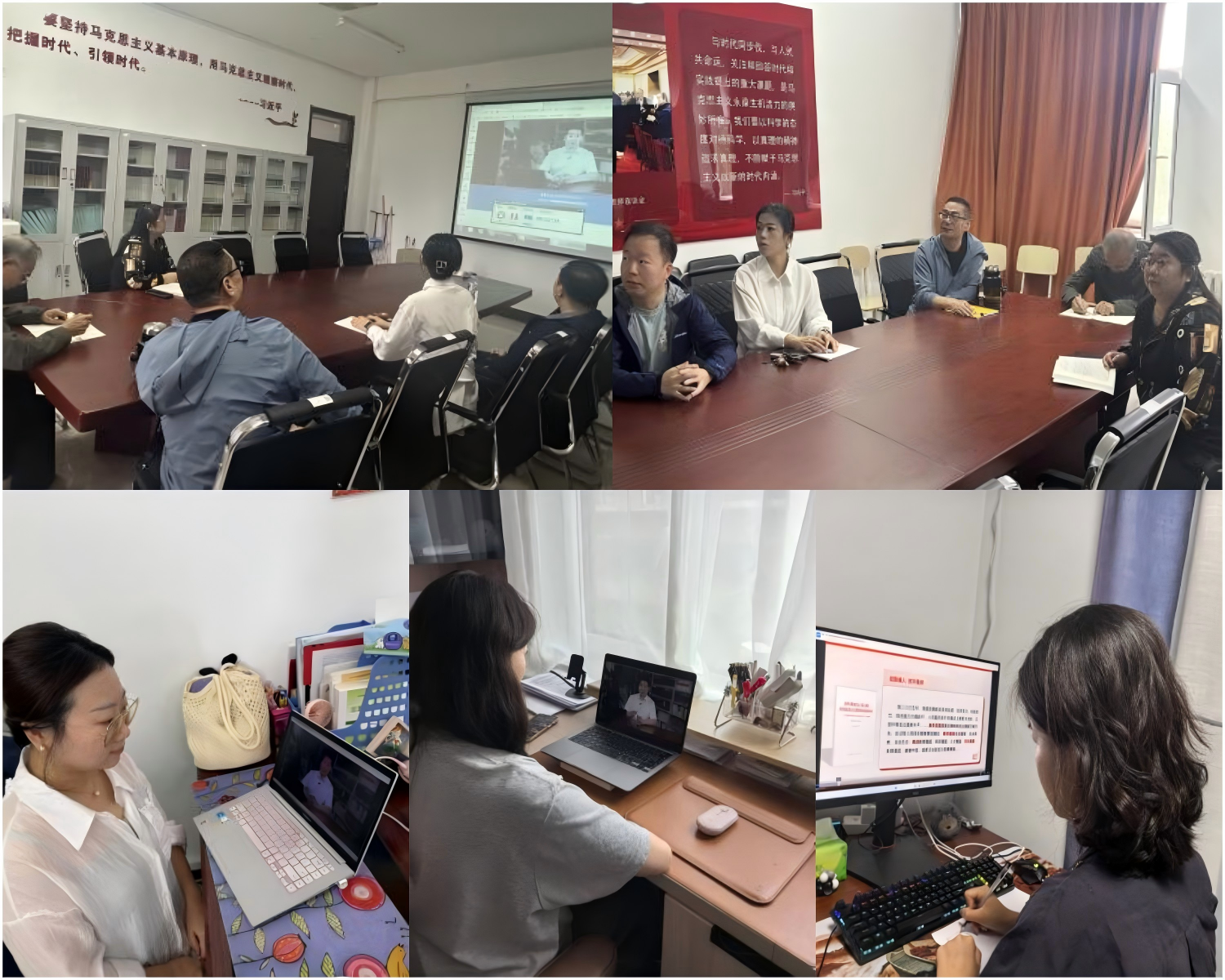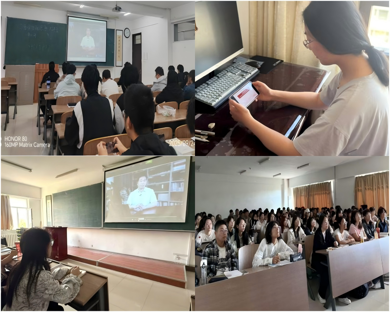 马克思主义学院无教学任务的教师集中收看直播,有教学任务的教师与学生共同在课堂收看录播视频。