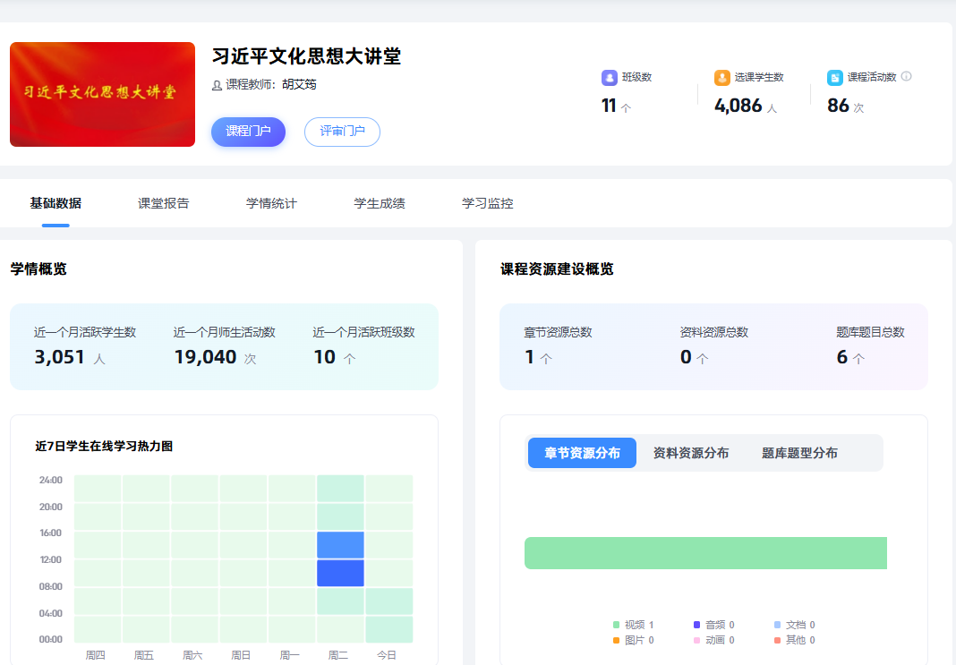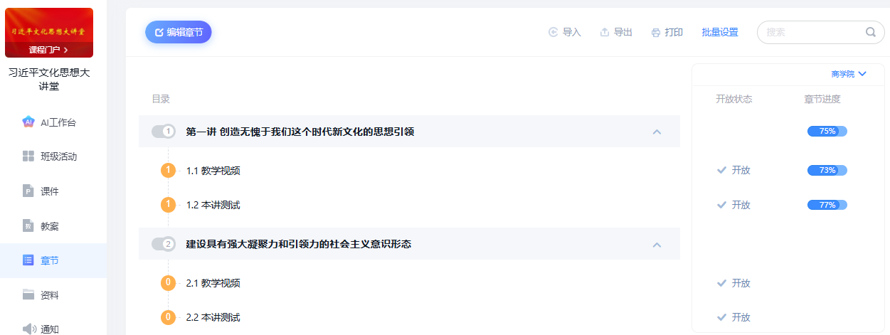 为满足全校学生的学习要求,马克思主义学院制定了《习近平文化思想大讲堂》课程实施方案。依托学习通平台开展线上课程教学,学生可通过电脑端、手机APP等终端进行线上自主学习。教学内容以录播课程为主。每讲之后设有测试题目,以检验学生学习情况。