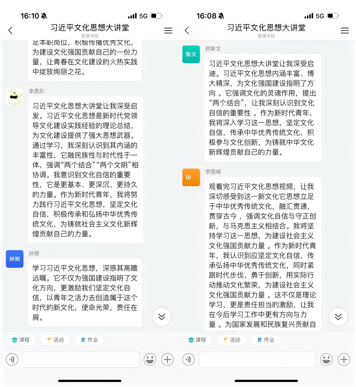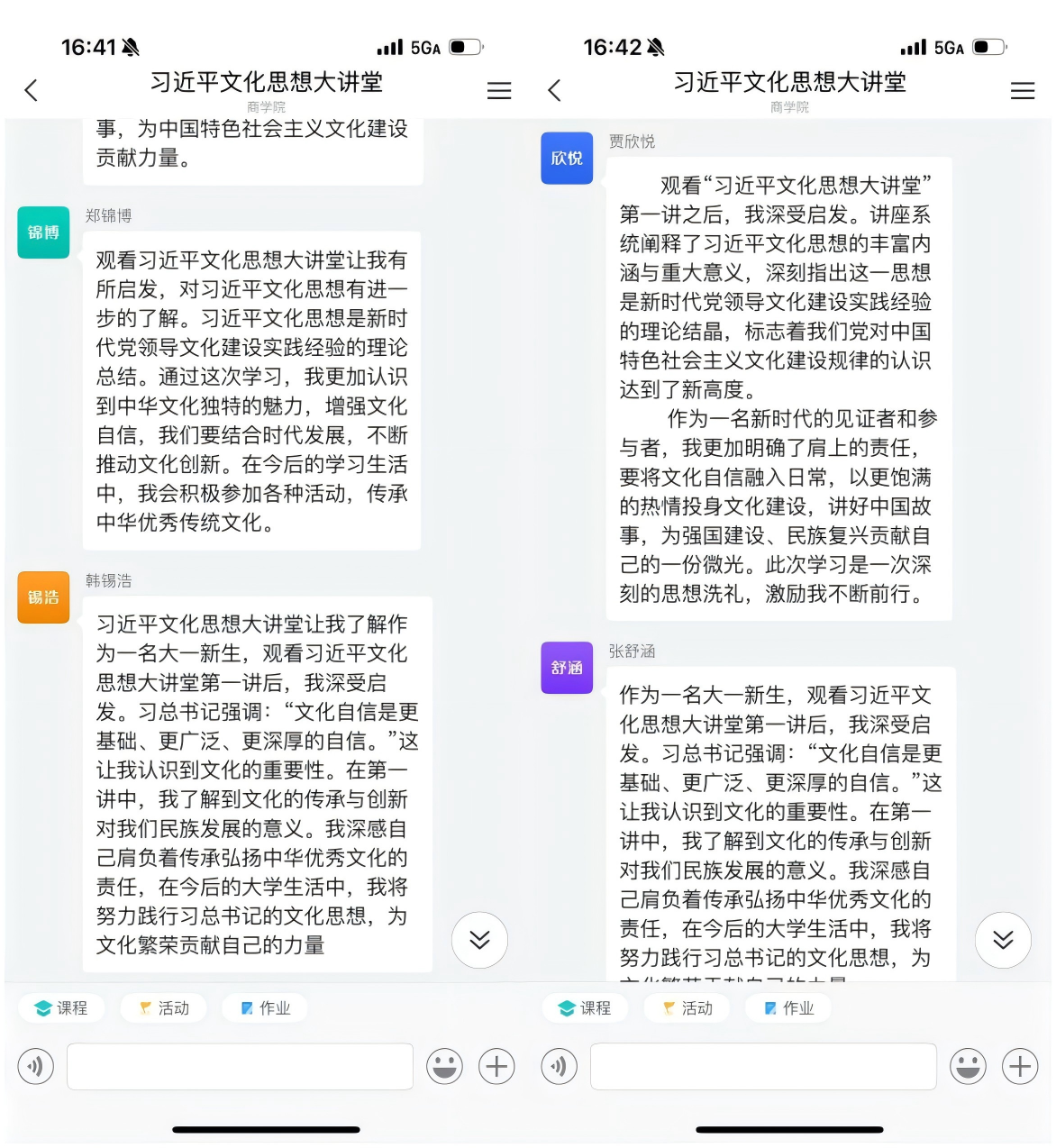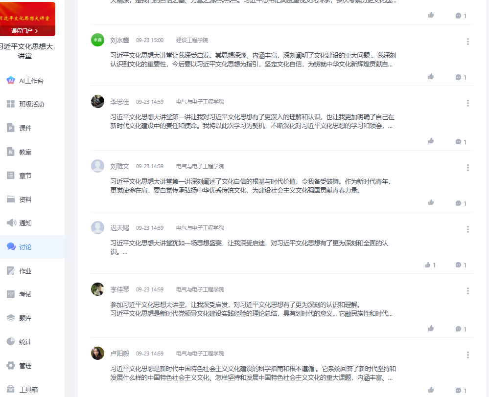 截至23日,已有4086名学生参加学习,线上完成学习测验1429人,参与课堂讨论122个,课后学生们反响热烈,纷纷在学习通班级空间中发表学习心得,留言超3000条。