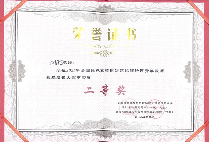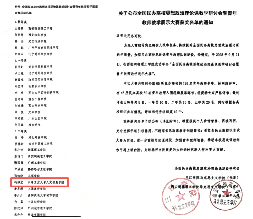 我校马克思主义学院冯静宜老师凭借扎实的理论功底、生动的教学设计与出色的课堂表现,荣获全国二等奖,是吉林省唯一获此荣誉的教师。这不仅体现了冯静宜老师个人较高的教学水平,也反映出学校在思政课教师队伍建设与教学质量提升方面的成效,彰显了我校作为民办高校在思政课建设上的努力与成果。