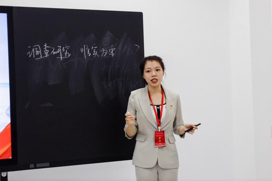 在教学展示环节,冯静宜老师于《毛泽东思想和中国特色社会主义理论体系概论》课程比赛中,以《调查研究 唯实为要》为题,梳理了党在各个时期的调研实践,强调了调查研究的重要性。