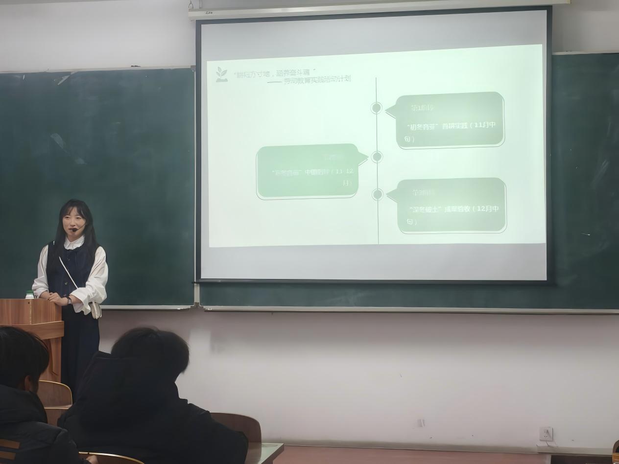 为深入贯彻落实“五育并举”育人方针,将思想政治教育融入劳动实践全过程,2025年11月19日下午,马克思主义学院思政班主任杨洋以“耕耘方寸地,涵养奋斗魂”为主题,为250341班同学启动了劳动教育系列实践课的首个环节——“初冬育芽”首耕实践活动。课程以“种下一粒种子,扛起一份责任”为切入点,拉开了为期两个月的劳动教育系列实践序幕。