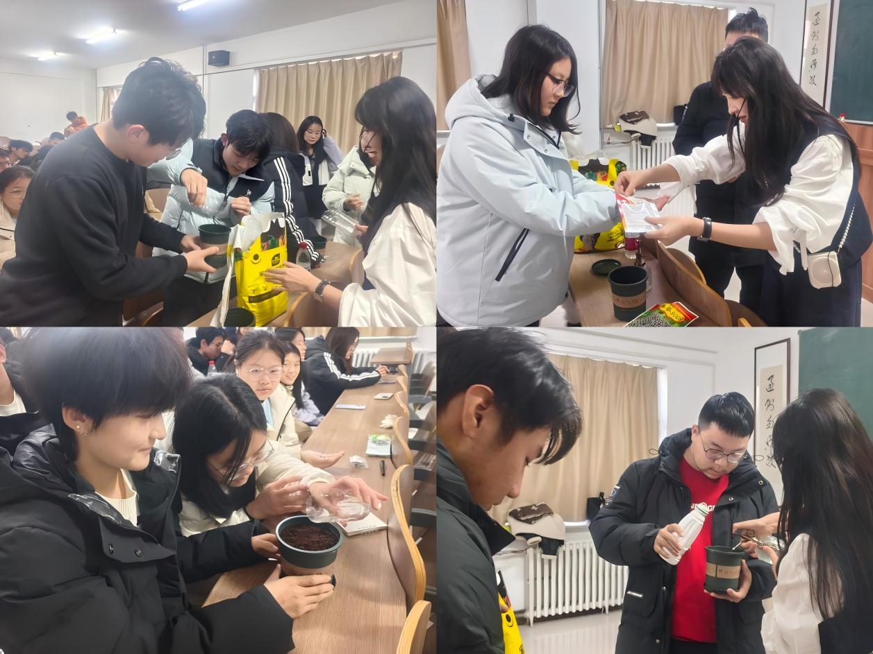 活动以寝室为单位组建“种植小分队”,各组领取花盆、土壤及香菜、向日葵等“责任种子”。从松土、播种到日常浇水养护,同学们全程投入,亲手开启与植物共同成长的奇妙旅程。这小小的一方花盆,成为思政教育的生动载体——每一次浇水都是对坚持的深情践行,每一次观察都是对责任的深刻诠释,让学生领悟到劳动不仅是体力的付出,更蕴含着“功成不必在我,功成必定有我”的崇高担当精神。